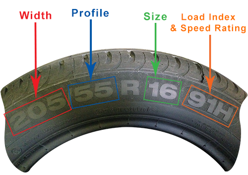 Not sure where to find the width, profile and size? See the image below for where to find the information on your tyre.